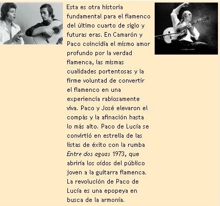La discografía en solitario de Paco de Lucía tiene una primera etapa que culmina con el álbum Almoraima. Son años dedicados a la creación de un lenguaje propio. A excepción de algún arreglo orquestal de José Torregrosa, en aquellos trabajos el protagonista absoluto es la fabulosa guitarra de Paco de Lucía. El disco dedicado a Manuel de Falla abre un paréntesis que significará el comienzo de un nuevo período. Fue durante la grabación de esa obra cuando Paco conectó con el grupo Dolores, y aquel encuentro acabaría por marcar el cambio radical que se materializa en el disco Sólo quiero caminar, donde el flamenco de Paco se proyecta hacia un universo musical sin fronteras, sin perder nunca las esencias. En el terreno de la fusión, los tríos de Paco con McLaughlin, Di Meola y Coryell han entregado una música felizmente mestiza y de apabullante éxito internacional. Hay que significar, en la carrera de Paco, el trío netamente flamenco que formó también con Juan Manuel Cañizares y su sobrino, José María Bandera. Para sus últimas giras, ha rehecho su 'sextet'. Duquende cubrió el puesto de Pepe de Lucía y El Viejín, el de Juan Manuel Cañizares. Con este magnífico equipo, presentó Luzía, nuevo álbum, netamente flamenco, con el que rompe un largo silencio discográfico-compositivo. Supera así una década negra en la que ha perdido a sus padres y a su 'hermano' Camarón. Paco de Lucía, caso único en la historia, ha cambiado ¡hasta tres veces! el rumbo de la sonanta y, por ende, de todo el flamenco. Paco de Lucía es, sin lugar a dudas, la máxima figura flamenca en los escenarios internacionales y españoles.